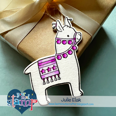 The gift tag was created by die cutting an extra llama, then sandwiching a string loop between the 2 llamas. This makes the tag sturdier too.